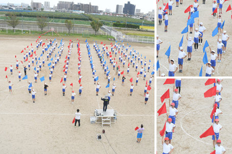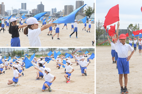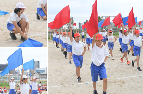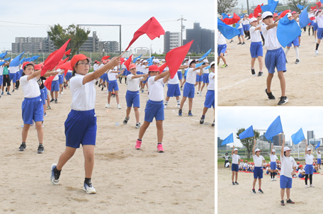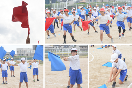 今日は、フラッグの練習を始めて5・6年生が合同で行いました。それぞれの立つ位置や、移動する場所などの確認をしました。