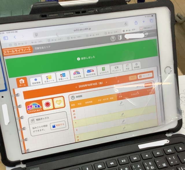 鞄の中にある用具をしまった後、みんな連絡帳を書いています。連絡帳が書けたら、Myタブレットに朝の「心の天気」を入力します。晴れ、曇り、雨、雷で入力します。
