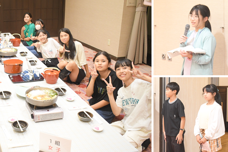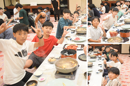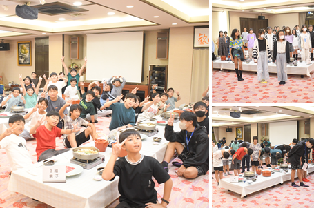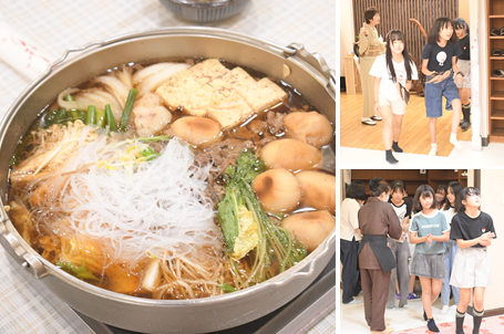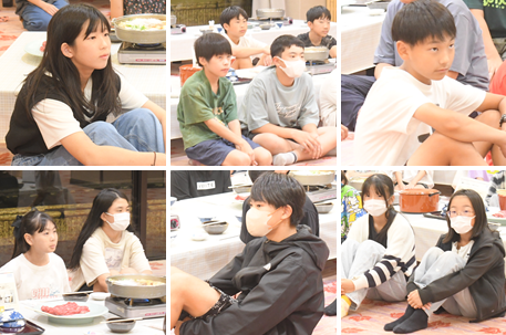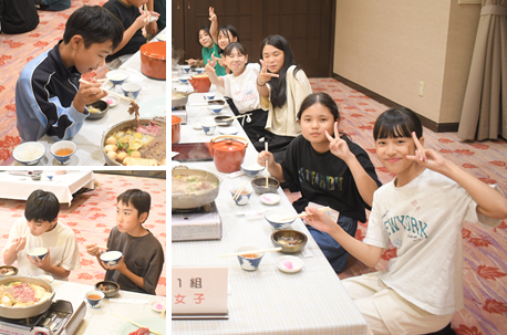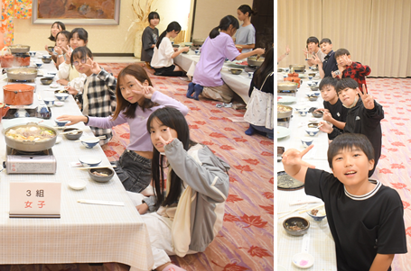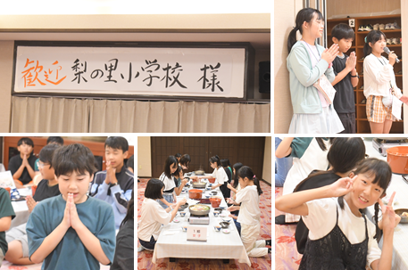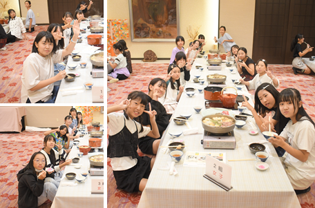待ちに待った夕食です。京都市内を歩き回ってお腹がペコペコです。今日の夕食は「すき焼き」です。ホテルの方々に感謝の気持ちを伝えて、みんなでいただきます!