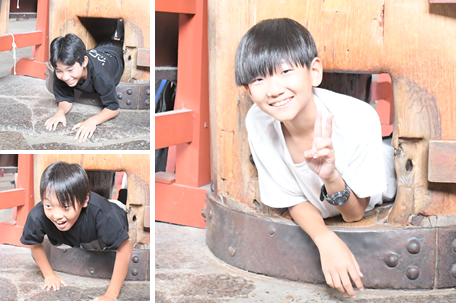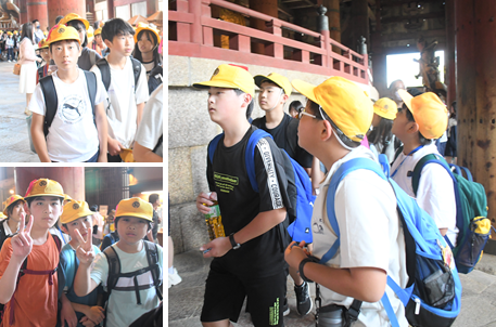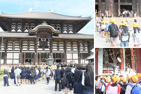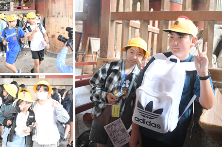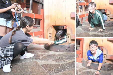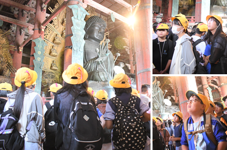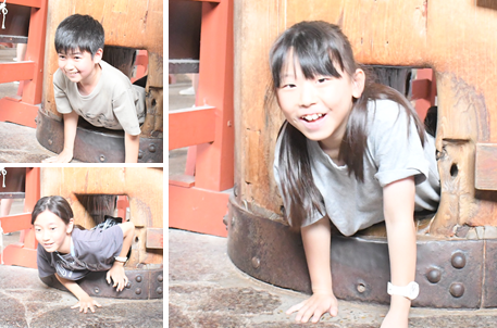 大仏殿に到着しました。みんな見上げています。たくさんの子が、柱に空いた大仏の鼻の穴のくぐり抜けに挑戦していました。