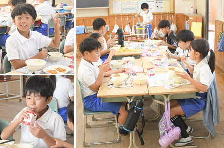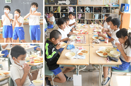 今日の献立は、むぎごはん、キムタクごはんの具、鳥ごぼうフライ、けんちん汁です。「キムタクごはんの具」とは、キムチとたくあんが入っている具材で、ごはんに混ぜて食べます。3年生の様子です。