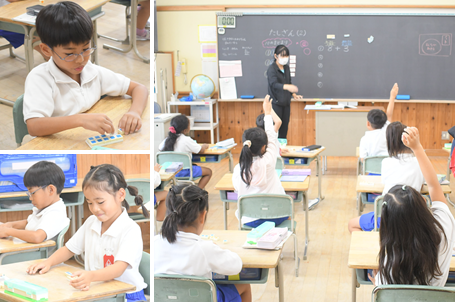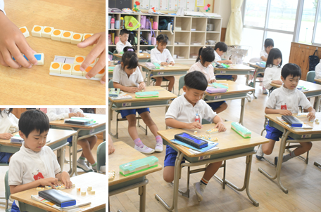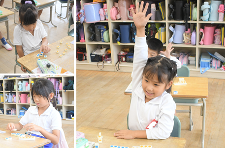 数図ブロックを使ってたし算の勉強です。10のまとまりを作って計算しています。