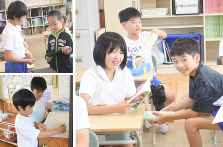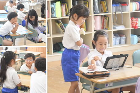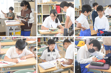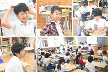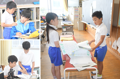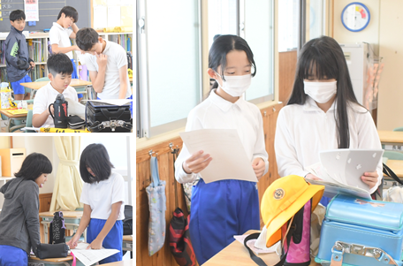月曜日の朝の様子です。教室に入り、宿題を提出し、連絡帳を記入して、友だちとおしゃべりをしている様子です。