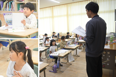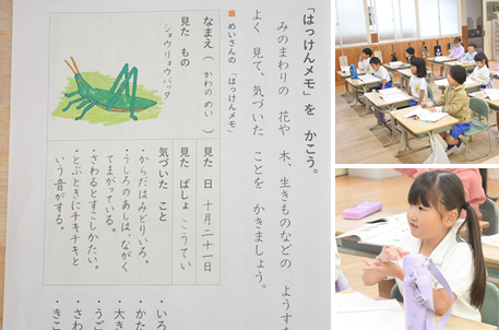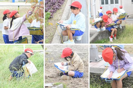 「はっけん したよ」身の回りの花や木、生きものの様子を友達に伝える文章を作ります。今日は運動場に出て「はっけんメモ」に書くものを探しました。