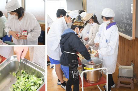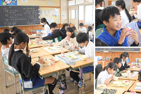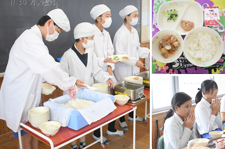今日の献立は、ごはん、鶏肉のてりやき、里芋のそぼろ煮、チンゲンサイの和風サラダです。6年生の様子になります。