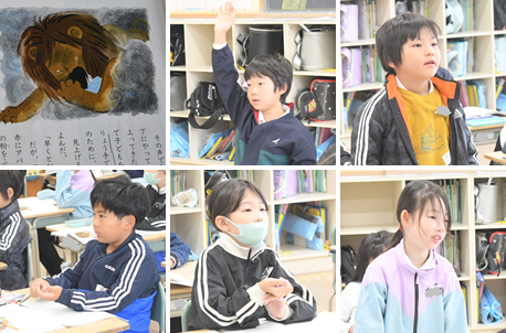 「サーカスのライオン」のお話です。第4場面です。男の子を助けるために「じんざ」がしたことを、文章中から読み取りました。