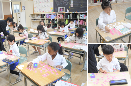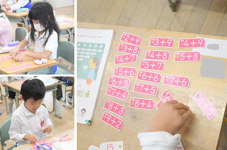 「たし算カード」を使って仲間集めをしています。たして同じ数になるカードを仲間分けしています。