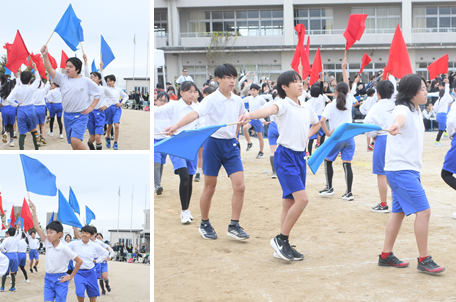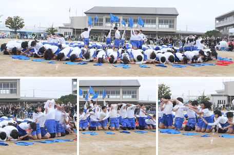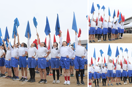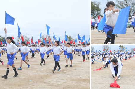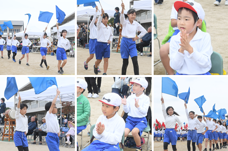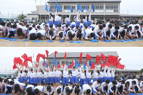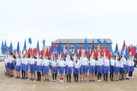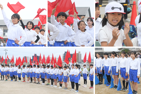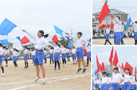 VIVA梨っ子!~みんなの思いを合わせ GUTS を見せろ~ 5・6年生によるフラッグ演技です。6年生は小学校の運動会最後の演技となります。集中して取り組んでいる様子をご覧ください。