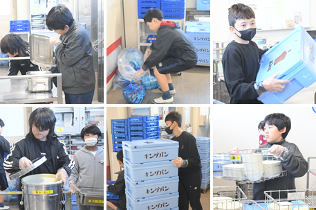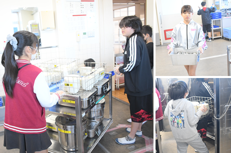 食べ終えた食器、食缶等をコンテナに片づけてくれています。5・6年生で協力して、とても手際よく作業をしてくれています。毎日ありがとうございます。