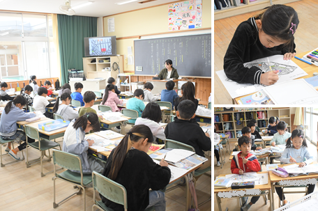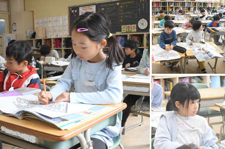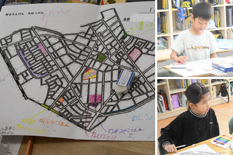 町探検に出かける準備をしています。学区にあるお寺や公園、公民館などの場所を地図で確認しました。