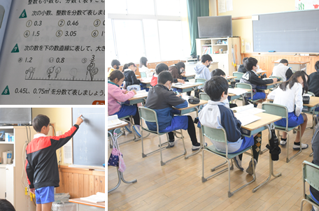 分数を小数に直したり、分数、小数の値を数直線上に表したりと、分数と小数、整数の関係について学習をすすめています。