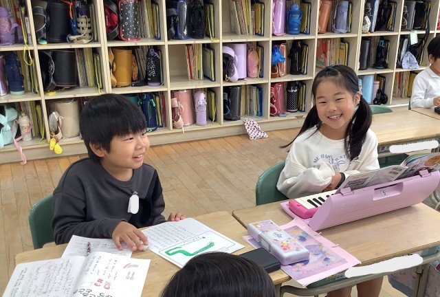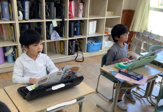 「山のポルカ」の伴奏の速さを変え、それに合わせて練習をしていました。ゆっくりな伴奏に合わせて練習した後、少しずつスピードアップさせると、どの子もその速さに挑戦して練習していました。吹き終わると、思わず笑顔がこぼれていました。