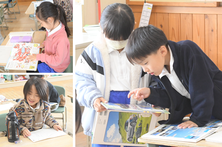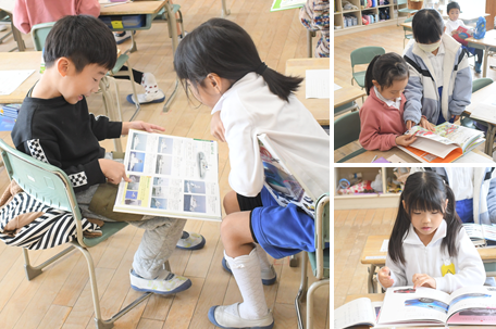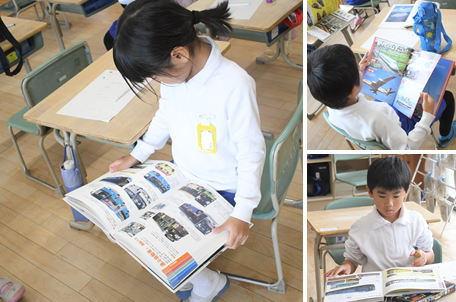乗り物を紹介する「のりものカード」を作ります。どんな乗り物を紹介するか、図鑑を見て調べています。