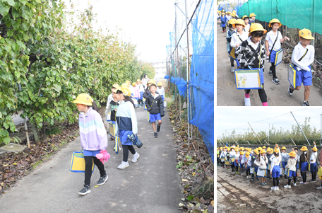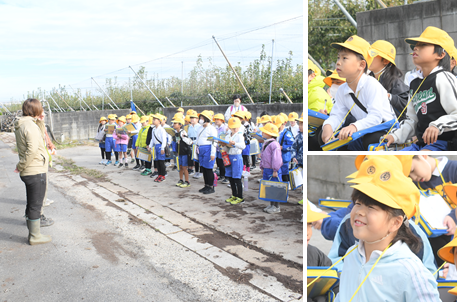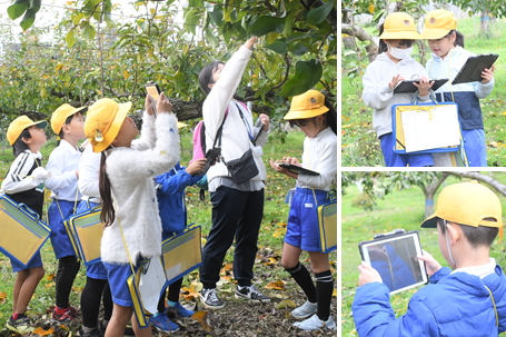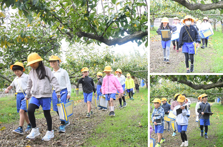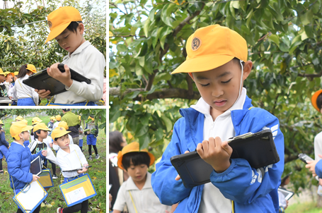 2年生は「町たんけん」で学区にある梨畑の見学をさせてもらいました。時期的に梨の実の収穫は終わっていますが、子どもたちは広い梨畑の木々を見て、気づいたことをメモしたり、タブレットで写真をとったりしました。
