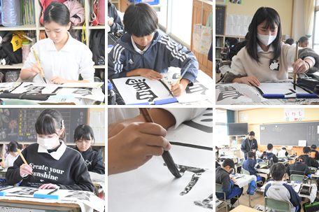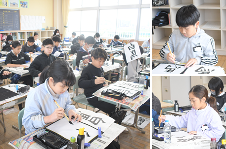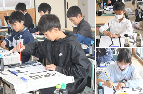 毛筆で「白馬」の清書をしています。文字の大きさに気を付けながら書いています。
