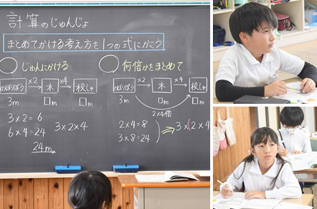 「計算の順序」の学習です。多くの数をかけるときは、計算する順序を変えても、答えは同じであることを学習しました。
