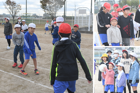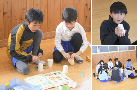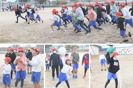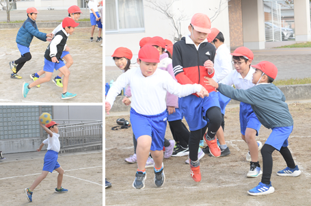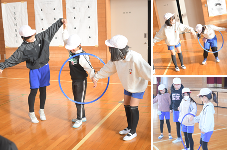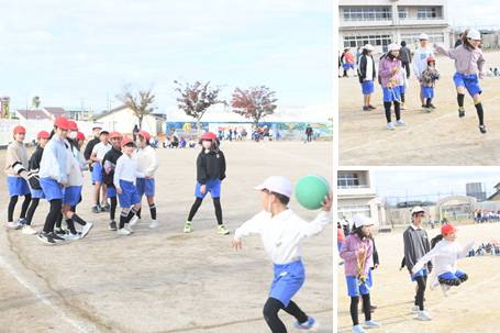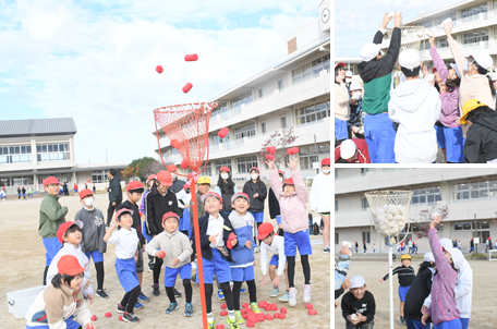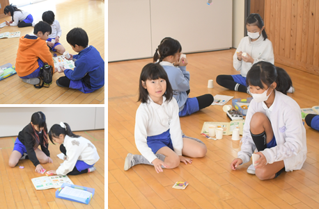 今日は朝の時間から1時間目にかけて「ペア活動」がありました。1・6年生、2・4年生、3・5年生がペアになり、今日は低学年が考えた内容で活動を楽しみました。運動場では1・6年生と3・5年生が、鬼ごっこやドッジボール、玉入れなどを楽しみました。体育館、多目的室の室内では、2・4年生がフラフープ渡し、コップとばしなどを楽しみました。