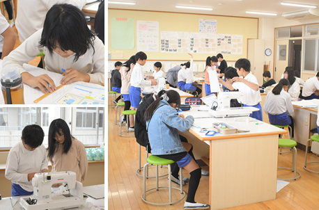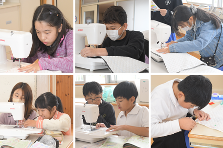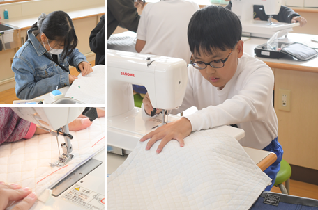 ナップサック作りの続きです。今日はいよいよミシンを使って縫います。しつけのできた子から、ボビンに糸を巻き、ミシン縫いに入りました。