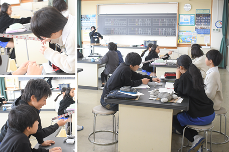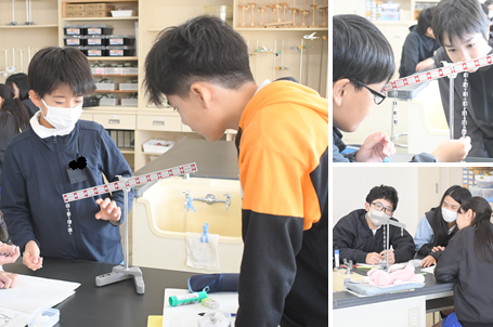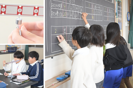 「てこのはたらき」の学習です。実験用てこが水平を保つための、左右の重りをつるす位置と、重りの数の関係を調べています。