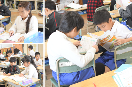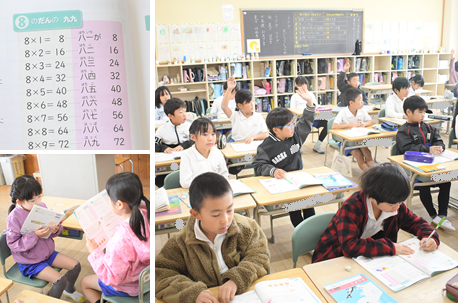 九九を覚えています。今日は8の段です。隣の友達と8の段の読み合わせをしています。