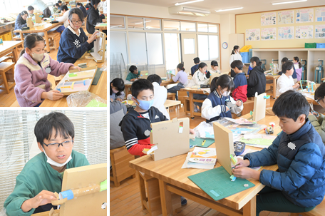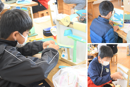 「ビー玉だいぼうけん」の制作中です。今日で完成の予定です。上手にビー玉が転がるようにコースの傾斜を調整しながら、楽しい動きになるように工夫しています。