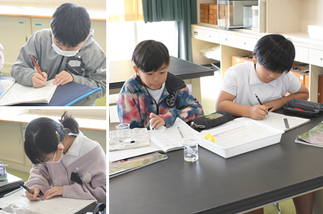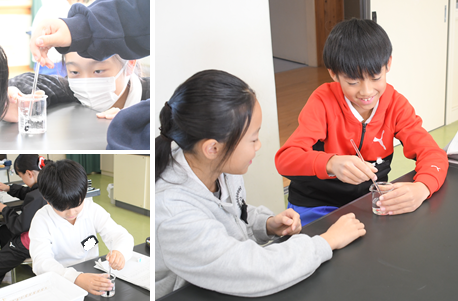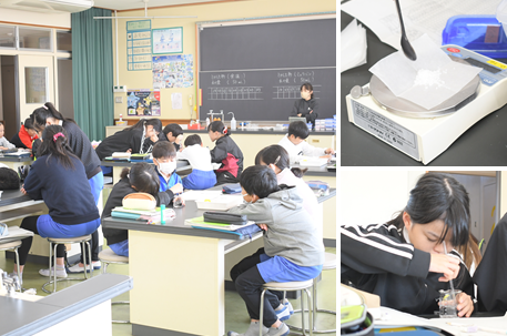 「ものの溶け方」の実験です。50㎖の水に、ミョウバンが何g溶けるか、ビーカーに水とミョウバンを入れてかき混ぜています。水に溶ける物質の量には限界があることを学習しました。