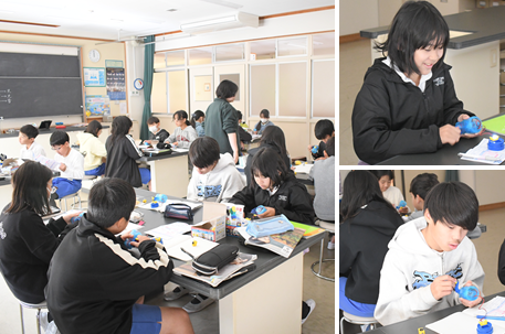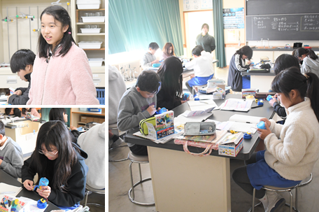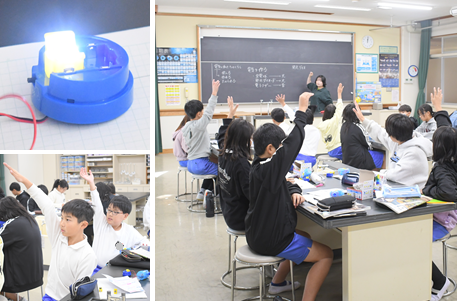 電気をつくる実験です。モーターを回して、発光ダイオードを光らせたり、電子ブザーを鳴らしたりしています。
