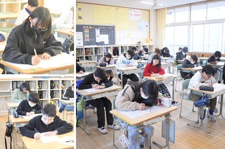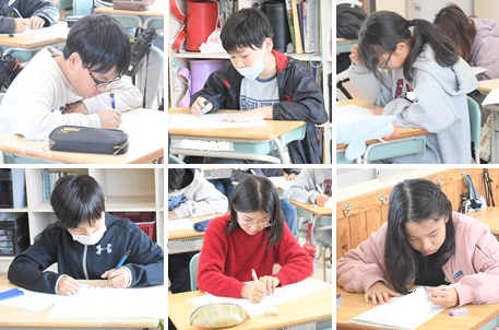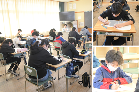 6年生は算数のまとめテストに取り組んでいます。面積や体積を求める問題が多く含まれています。1回で合格できるといいですね。