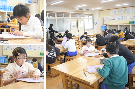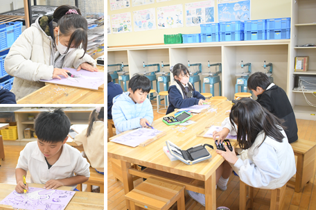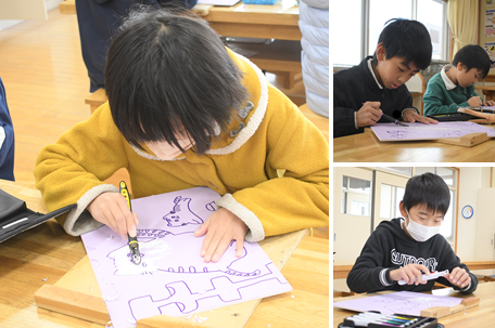 彫刻刀で版画板を掘っています。最近の版画板は、昔のような木製ではないため、繊維がなくどの方向にも彫りやすくなっています。怪我をしないように、支える手の位置に注意をして作業をすすめてくださいね。