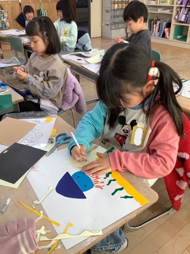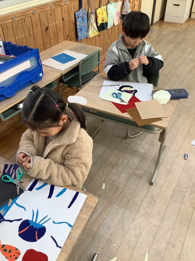 「深い海にすむ生き物」をテーマにして、カラー版画に取り組んでいました。