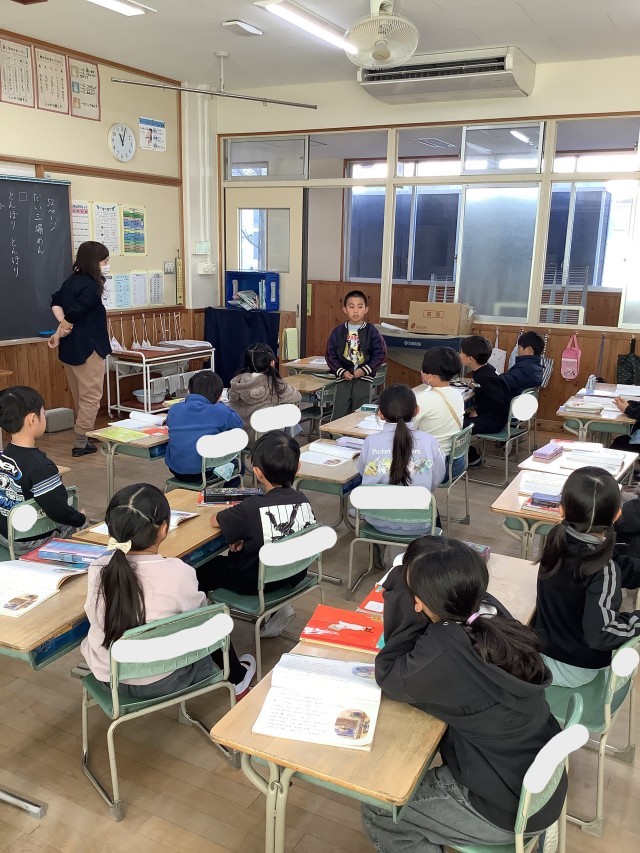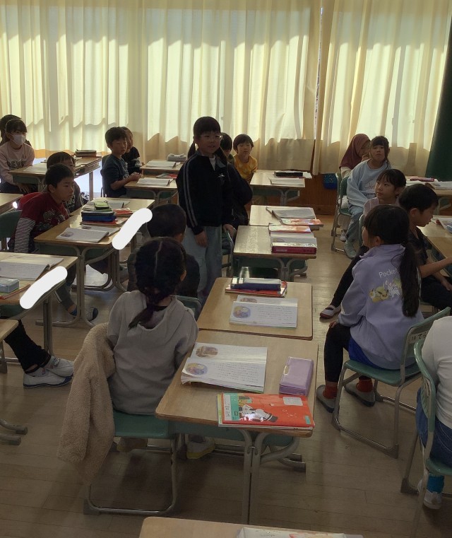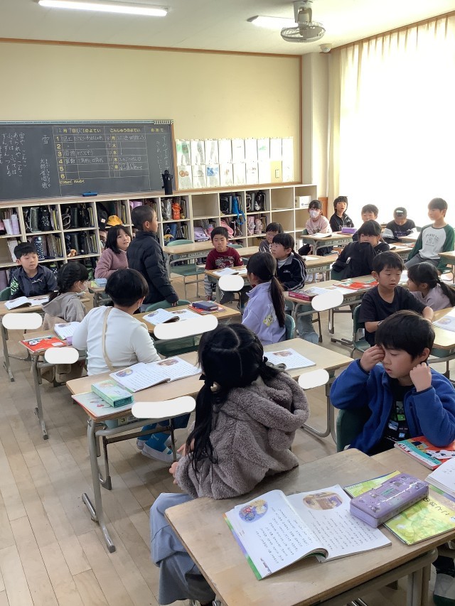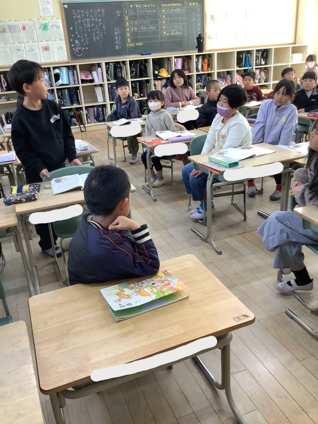 国語は「かさこじぞう」です。じぞうさまにかさをかぶせた時の気持ちをグループで発表し合った後、全体で共有しました。