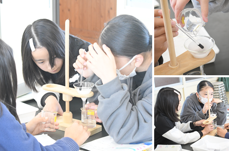 今日は、溶けているものを取り出す実験をしています。食塩とミョウバンの水溶液をろ過して、溶けているものを取り出せるか実験しています。
