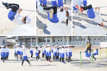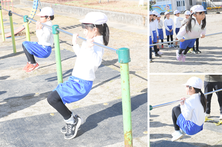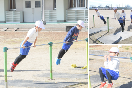 天気が良く、とても暖かい日となりました。2年生が運動場で鉄棒に取り組んでいます。「ツバメ」や「ダンゴムシ」、「ナマケモノ」などの技に挑戦しました。