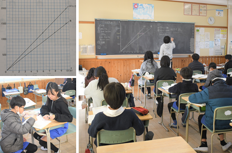 「グラフから読み取ろう」マラソン大会に参加した2人の走った時間(x分)と、道のり(ym)を表した2つの比例のグラフがあります。このグラフから読み取れることには何があるでしょうか?