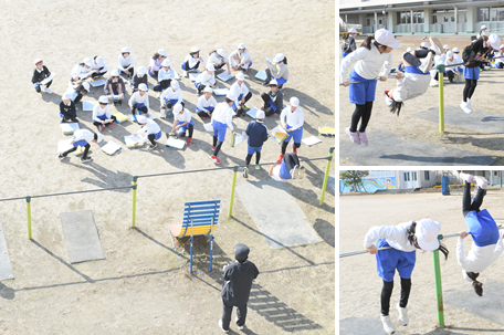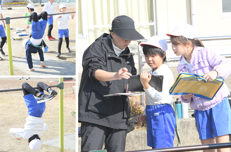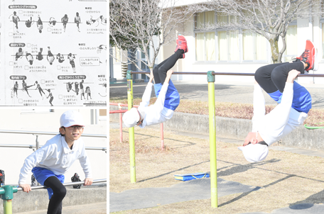 鉄棒に取り組んでいます。学年が上がるにつれ、技も難しくなってきます。「抱え込み前回り」や「両ひざかけ倒立下り」などの技を練習しています。友達どうし、タブレットで撮影し、技ができているかどうか確認しています。