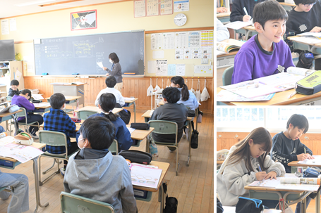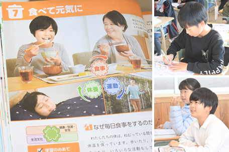 「食べて元気に」食事をすることの大切さを学習しています。今日は、給食の献立に使われている食材を調べました。