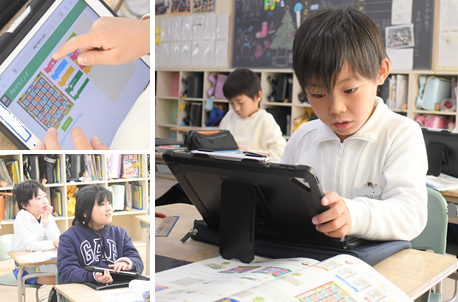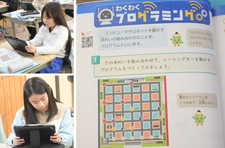 プログラミングの学習です。「前へ進む」「右を向く」「左を向く」の3つの命令を組み合わせて、レーシングカーを目的の場所まで移動させます。いろいろなプログラムの組み方ができます。