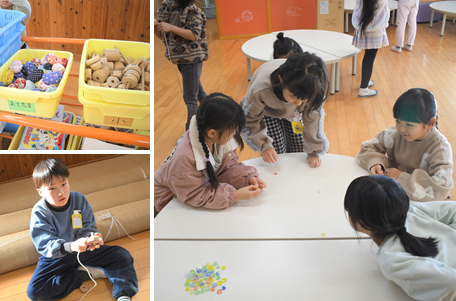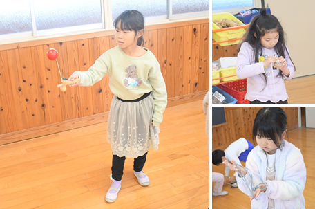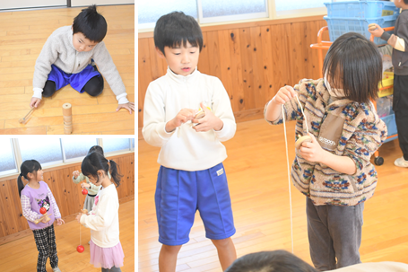 1年生は、生活科室にある、「けん玉」や「おはじき」「コマ回し」などの昔の遊びを楽しみました。