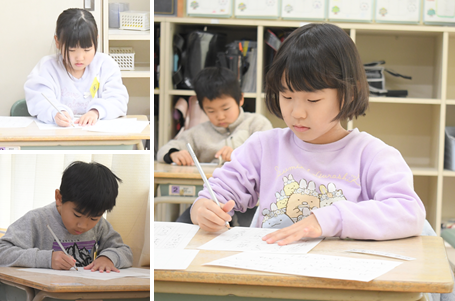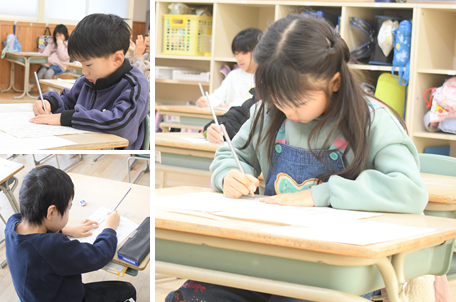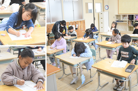 今日は1・2時間目に全校で書初めに取り組みました。1年生は初めての書初めを硬筆で取り組みます。一文字ずつ丁寧に書くことができました。