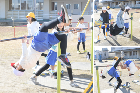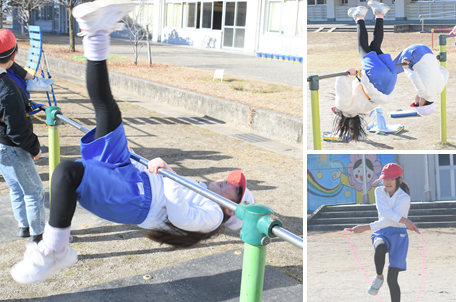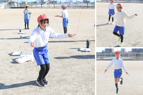 鉄棒と短縄跳びに取り組んでいます。鉄棒では補助具を使いながら逆上がりに挑戦しています。吹く風が冷たい中、子どもたちは頑張っています。
