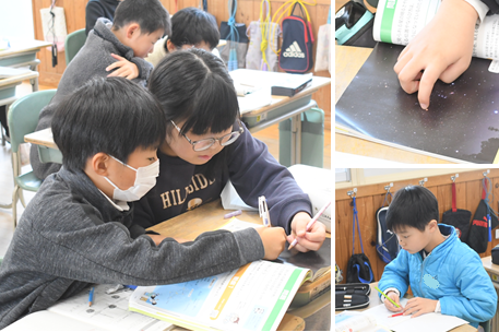 「冬の星」の学習です。冬に見られる星の明るさや色、並び方がどうなっているか、時間が経つとどのように移動していくかなどを勉強しました。