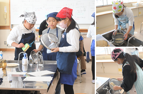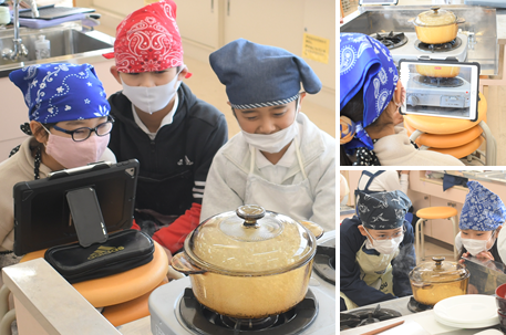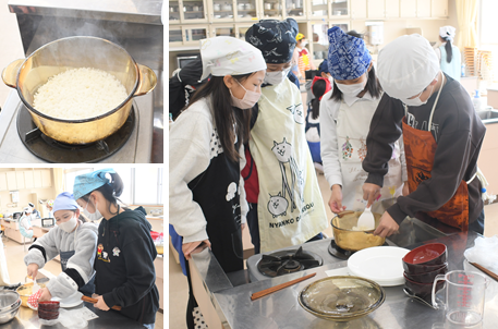 収穫した米を炊飯しています。班ごとに2分づきから、8分づきまで精米率を変えて、味を比べました。