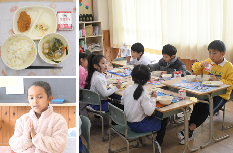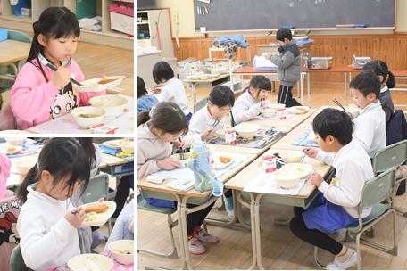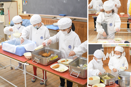 今日の献立は、ごはん、あじの磯辺フライ、大豆の親子サラダ、すずなとすずしろの鶏だんご汁です。1年生の様子です。