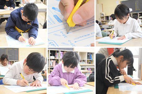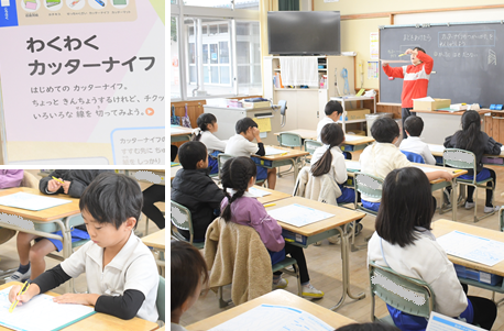 2年生は初めてカッターナイフを扱います。「まどのあるたてもの」を制作しますが、今日はカッターナイフの使い方の練習をしました。直線やなみ線をカッターナイフで切りました。けがをしないように集中して取り組みました。