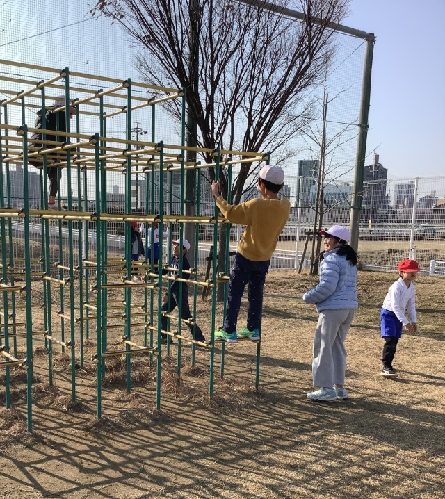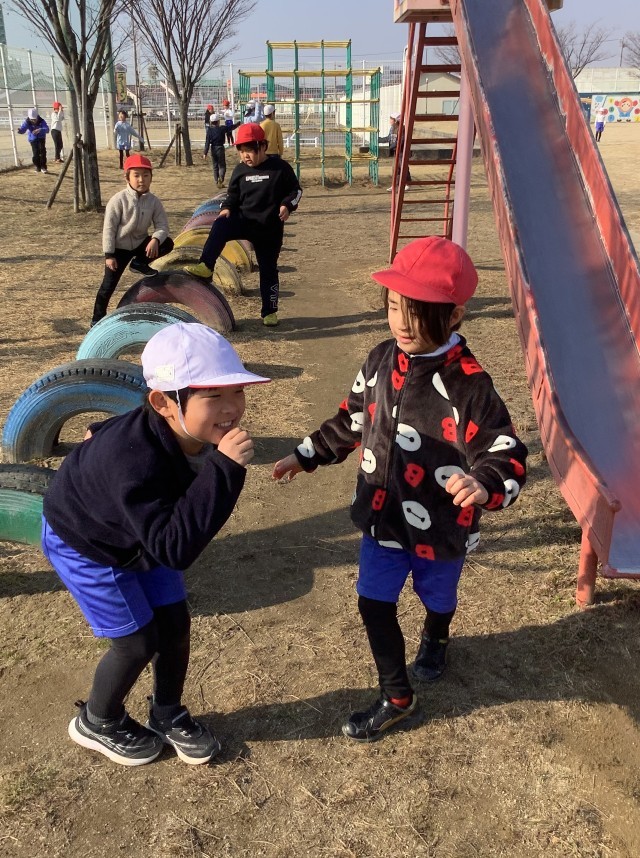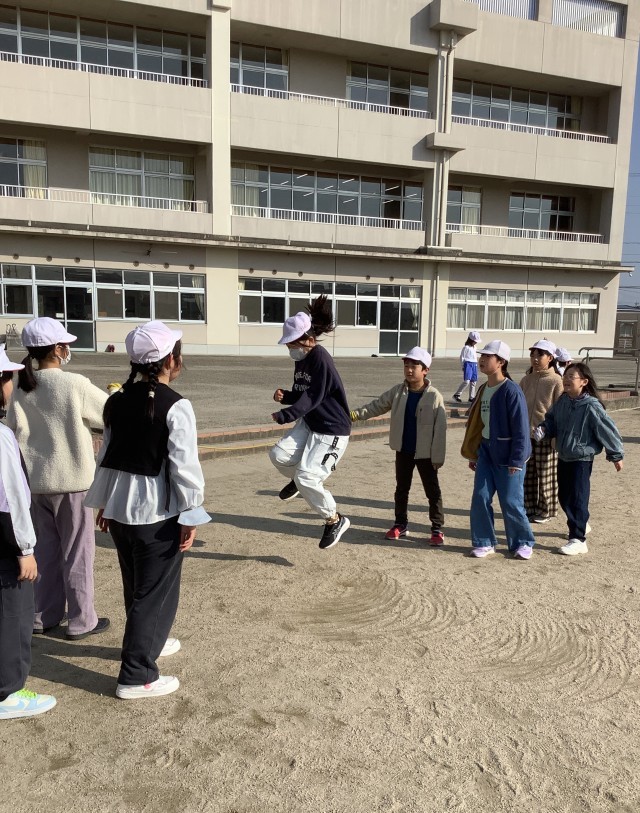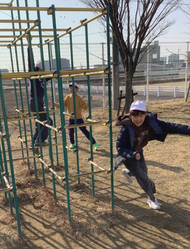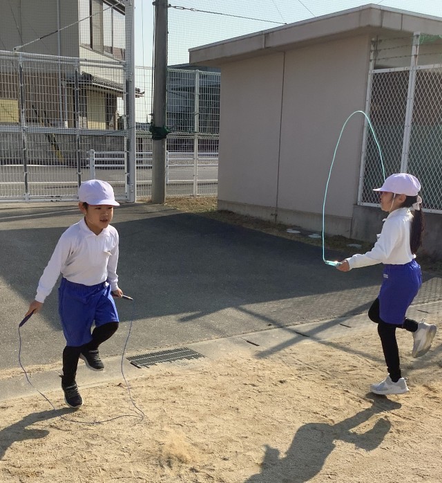 今日の元気タイムは暖かく、たくさんの子が外で思い思いの遊びを楽しんでいました。長縄を練習する子たちがたくさんいる中、サッカー、一輪車、短縄跳び、鬼ごっこ、遊具など、仲間と笑顔で遊んでいました。