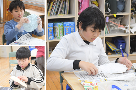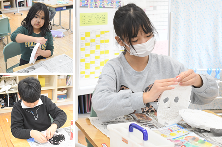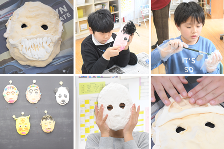 紙粘土で「お面」の制作に取り組んでいます。子どもたちは各自の創意で立体を表現しています。出来上がった作品は「二本木公民館まつり」に展示する予定です。