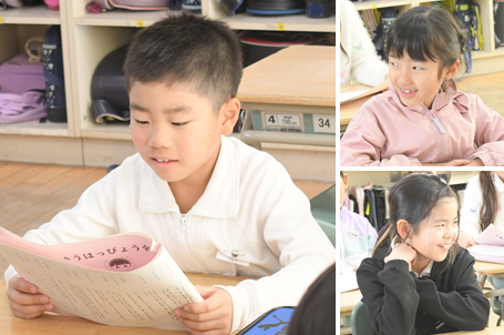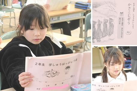 学習発表会に向けて練習をしています。国語の授業で勉強をした「かさこじぞう」のセリフを役割分担をして音読しています。
