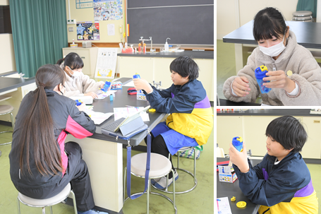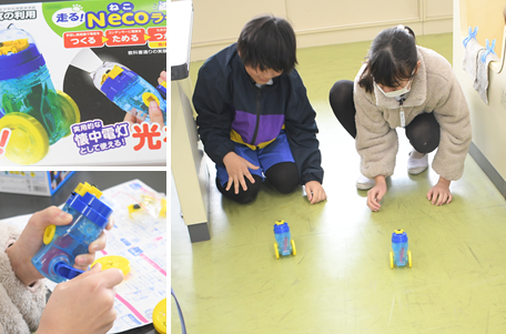6年生が理科の実験をしています。モータを手で回してコンデンサに電気を貯め、電気エネルギーを光や動力に変える実験をしています。