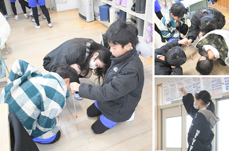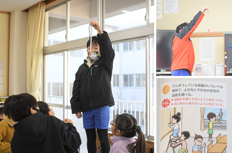 「空気のあたたまり方」の学習です。教室内の温度を測定しています。床に近い場所と、天井に近い場所では温度が違うのでしょうか?