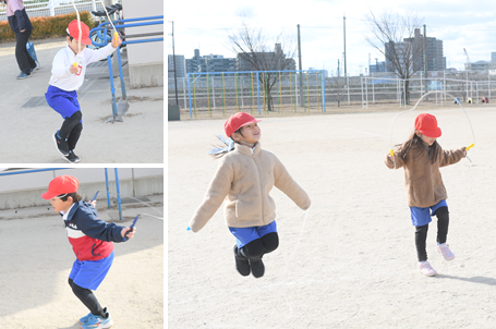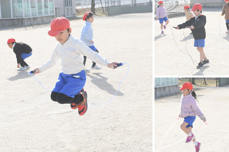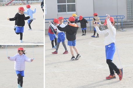 今日もとても寒いですが、1年生は運動場で短縄跳びに取り組んでいます。前回しや後ろ回し、駆け足跳びに挑戦しています。